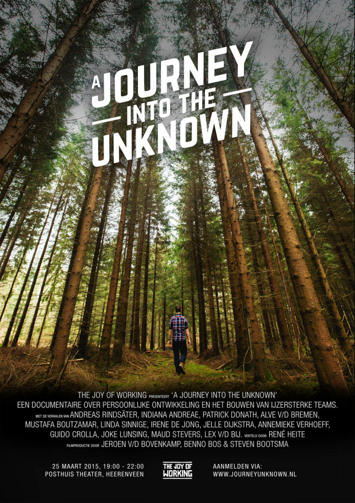 a Journey Into the Unknown is een documentaire over persoonlijke ontwikkeling en teamwork. Wij wilden met deze documentaire mensen laten zien wat deze onderwerpen betekenen, door verschillende inspirerende experts op dit gebied te interviewen. Ik kende Andreas Rindsäter van het ’The Joy of Making’ project en wist dat hij een interessant levensverhaal had. Daarom hebben we Andreas als rode draad genomen en de andere experts zijn verhaal laten versterken. Zo ontstond er één compleet verhaal. Ik heb dit project gedaan in samenwerking met Jeroen v/d Bovenkamp en Steven Bootsma.